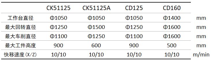 CK51125: 動梁,T型滑枕,雙十字滑臺結構,強力手動卡爪,電動四工位刀架,伺服系統,高檔數控立式工作臺車床。 CK51125A:定梁、矩形滑枕、帶刀庫,伺服系統,高檔數控立式車床,可選配大規格液壓卡盤。 CD125、CD160:定梁,矩形滑枕,單刀座,無防護的經濟型數控立式車床。